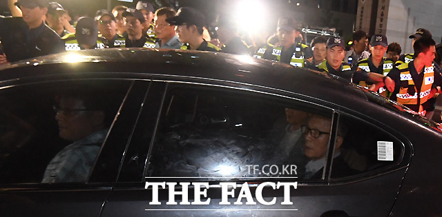 [더팩트ㅣ이새롬 기자] 박근혜 정부 시절 이른바 '문화계 블랙리스트' 작성을 지시한 혐의로 2심에서 징역 4년을 선고받은 김기춘 전 대통령 비서실장이 구속기간 만료로 6일 새벽 석방돼 서울 송파구 동부구치소를 나서는 가운데, 이를 반대하는 시민들이 김 전 실장의 차량을 둘러싸고 대치하고 있다.