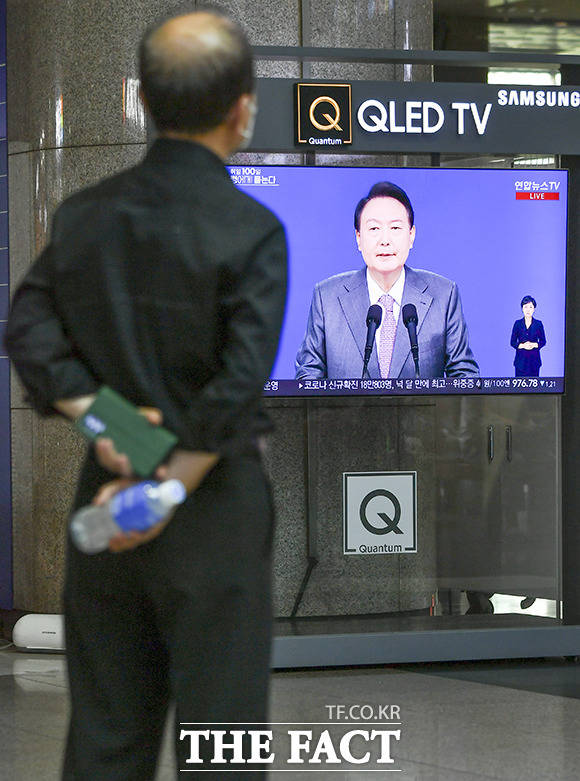[더팩트ㅣ윤웅 기자] 17일 오전 서울 용산구 용산역 대합실에서 시민들이 윤석열 대통령 취임 100일 기자회견을 TV 생중계로 시청하고 있다.
