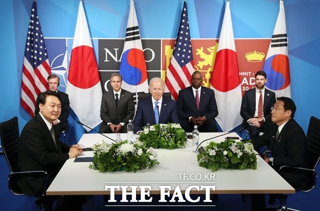 지난 6월 29일 스페인 마드리드에서 열린 북대서양조약기구(NATO, 나토) 정상회의에 참석한 윤 대통령은 다자외교 데뷔전을 치렀다. 나토 순방 당시에는 비공식 한미일 3국 정상회담이 열렸다. 세 나라 정상이 만난 것은 2017년 9월 이후 4년 9개월 만이다.