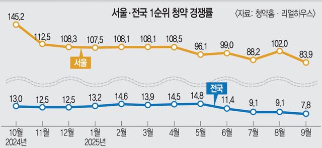 22일 분양평가 전문회사 리얼하우스에 따르면 지난달 전국 평균 1순위 청약 경쟁률은 7.78대 1로 집계됐다. 2023년 9월(7.0대 1) 이후 2년 만의 최저치다. 높은 경쟁률을 기록해온 서울도 지난달엔 83.88대 1로 지난해 7월(90.07대 1) 이후 가장 낮은 수치를 보였다. 수도권 지역의 주택담보대출 한도 6억원 제한, 소유권 이전 조건부 전세대출 금지 등의 여파 영향으로 분석된다.