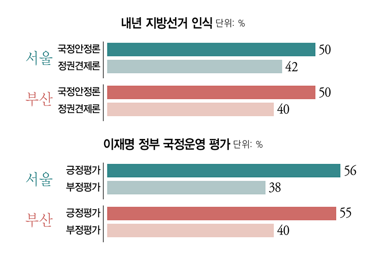 한편 현 정부의 국정운영평가에 대해 서울은 56%, 부산은 55%가 긍정적이라고 답했다. 부정평가는 각각 38%와 40%였다. 이 조사에서도 서울의 20대 남성의 경우 부정평가가 53%로, 긍정평가(37%)보다 16%포인트 가까이 높았다. 서울 40대와 50대의 긍정평가는 각각 75%와 70%에 달하는 것으로 집계됐다.