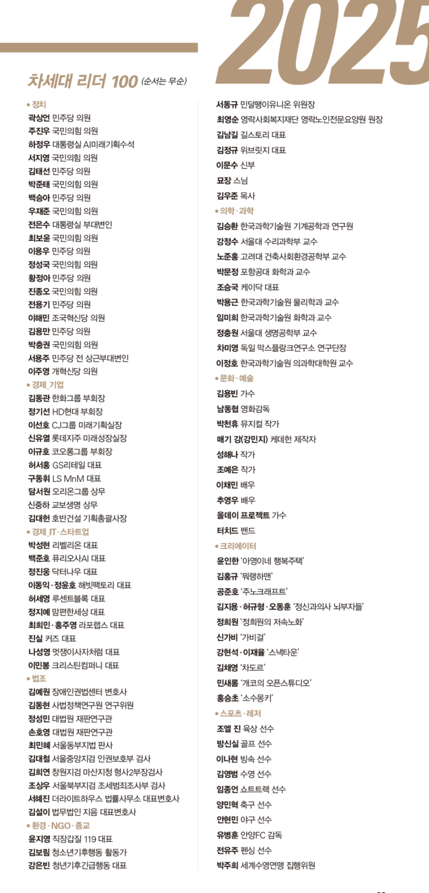 '2025 차세대 리더 100' 선정 과정은 지난해와 대동소이하다. 정치, 경제(기업·IT·스타트업), 사회(법조·환경·NGO·종교·의학·과학·크리에이터), 문화(예술·영화·방송연예·스포츠·레저) 등 각 분야에서 내일의 대한민국에 큰 영향력을 행사할 것으로 예측되는 인물 100명을 추렸다.