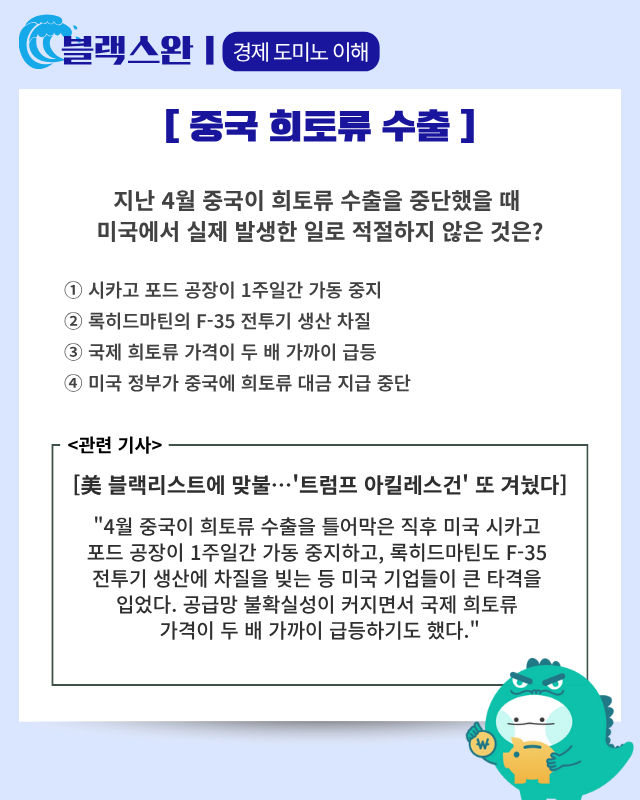 ■ 희토류 무기화: 중국 상무부가 희토류 17종 전체와 관련 기술의 수출을 통제하고 14nm 이하 로직칩이나 256층 이상 메모리반도체 제조용 희토류는 개별 심사하기로 했다. 중국은 전 세계 희토류 채굴량의 70%, 정제 및 가공 분야에서 90%의 압도적 점유율을 자랑하며 이번 조치로 첨단산업 전반에 파장이 예상된다.