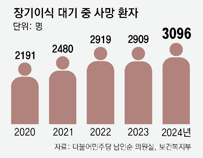 지난해 장기이식을 기다리다 사망한 환자 수가 처음으로 3000명을 넘긴 가운데, 장기를 이식받은 환자들도 기증을 받기까지 기다리는 기간이 늘어나고 있는 것으로 나타났다. 더불어민주당 남인순 의원이 10일 보건복지부로부터 제출받은 자료에 따르면 신장 이식 대기자의 평균 대기 기간은 2020년 2222일에서 올해 6월 2888일까지 늘어났다. 같은 기간 췌장 이식 대기 기간은 1391일에서 2604일로, 간 이식의 경우 132일에서 204일로 늘어났다. 다만 심장은 대기 기간이 2020년 316일에서 올해 6월 198일로 줄었고, 폐 이식은 같은 기간 238일에서 202일로 다소 줄어든 것으로 나타났다. 장기이식까지 대기 기간이 늘어나는 건 장기이식을 필요로 하는 환자가 늘고 있는 반면에 장기기증 인원은 줄어들고 있기 때문이다. 장기이식 대기 환자 수는 2020년 3만5852명에서 지난해 4만5567명까지 늘어났다. 하지만 한국장기조직기증원에 따르면 뇌사 장기기증자 수는 2016년 573명에서 2022년 405명까지 줄었고, 지난해엔 397명이었다. 국내 장기기증 희망 등록자는 지난해 말 기준 183만8530명으로 전체 인구의 3.5%에 불과하다. 인구 100만 명당 뇌사 장기기증자는 약 8명으로 스페인(46명), 미국(44명), 영국(21명) 등에 미치지 못한다. 장기기증 감소는 2017년 기증자 사후관리가 부실하다는 보도로 장기기증에 대한 부정적 인식이 확산된 데다 신종 코로나바이러스 감염증(코로나19)까지 겹친 영향이 컸다. 전문가들은 장기기증 희망 등록이 활성화되도록 제도를 개선하고 기증자에 대한 예우를 강화해야 한다고 강조했다. 장기기증 기준을 현재 뇌사자에서 심정지 환자로 확대하면 잠재 기증 환자 규모를 쉽게 파악할 수 있고 대상자도 늘어 장기기증이 30% 정도 증가할 것이란 전망도 나온다. 김동식 고려대안암병원 간담췌외과 교수는 “현재로서는 심정지 후 장기기증이 (장기기증을 늘릴 수 있는) 가장 빠르고 현실적인 대안”이라고 설명했다. 김자현 기자 zion37@donga.com박경민 기자 mean@donga.com}