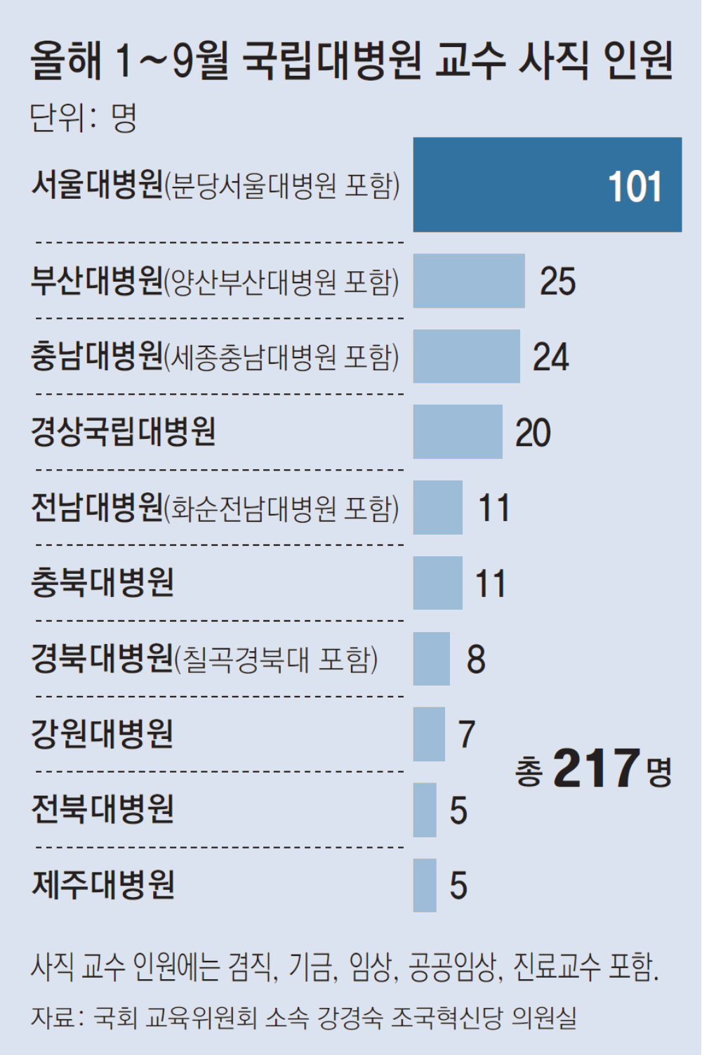 올해 상반기(1∼6월) 전국 10개 국립대병원이 교수 800여 명을 채용할 계획이었으나 당초 계획의 절반도 채우지 못한 것으로 나타났다. 올해 1∼9월에는 국립대병원 교수 217명이 사직했다. 21일 국회 교육위원회 소속 강경숙 조국혁신당 의원이 서울대병원 등 전국 10개 국립대병원(분원 포함)에서 받은 ‘2025년 국립대병원 교수 채용 및 사직 인원’ 자료에 따르면 10개 국립대병원은 상반기 806명을 뽑겠다고 채용공고를 냈으나 372명(46.2%)만 채용했다. 병원들이 채용 목표치를 채우지 못한 가운데 국립대병원에 근무하던 교수들의 사직도 이어졌다. 올해 1∼9월 10개 국립대병원에서 사직한 교수는 217명이었다. 지난해 상반기 의정 갈등으로 전공의들이 병원을 떠나 교수들의 업무 강도가 높아졌고 결국 223명이 그만뒀을 때와 비슷한 규모다. 국립대병원 교수들이 그만두는 이유 중 하나는 높은 근무 강도와 비교할 때 상대적으로 낮은 연봉 때문인 것으로 보인다. 기타 공공기관으로 지정된 국립대병원은 법정 한도 내에서만 의료진 인건비를 지급할 수 있어 민간병원과 비교할 때 급여 수준이 낮은 편이다. 의료계에서는 3차 의료기관인 국립대병원의 인력난이 계속된다면 비수도권에서는 권역 내 ‘최종 치료’가 어려워질 수 있다는 지적이 나온다. 정부는 국정과제로 국립대병원 소관 부처를 보건복지부로 이관하고 권역 거점병원으로 육성하는 방안을 추진하고 있다. 복지부 관계자는 “복지부로 이관되면 별도 산하 기관으로 분류해 인건비 법정 한도를 적용받지 않는 방안을 추진할 계획”이라고 밝혔다.국립대병원 사직 교수 39% 필수과… “지방 더 심각, 의료공백 우려”“개원하면 당직 안서도 2배 벌어”… 민간과 달리 인건비 한도 정해져‘스타교수’ 영입하기도 쉽지 않아국립대병원 10곳중 9곳 자본잠식… 인프라 투자 못한채 존폐 기로21일 국회 교육위원회 소속 강경숙 조국혁신당 의원이 전국 10개 국립대병원(분원 포함)으로부터 제출받은 자료에 따르면 올해 1∼9월 사직한 교수 217명 중 85명(39.2%)은 내과, 외과, 산부인과, 소아청소년과, 심장혈관흉부외과 등 필수 진료과목이었다. 서울대병원은 본원에서만 올해 내과 교수 13명이 그만뒀다.● 사직 교수 5명 중 2명은 필수과 소속국립대병원의 교수진 이탈이 계속되는 이유로는 상대적으로 낮은 연봉과 높은 근무 강도가 꼽힌다. 충청권 국립대병원 교수는 “국립대병원 교수 연봉은 최대 2억 원 수준인데, 사직하고 개원을 하게 되면 당직을 서지 않고도 2배를 벌 수 있다”며 “나가지 말라고 잡기가 민망한 수준”이라고 전했다. 한 국립대병원은 인력 부족으로 병원장이 직접 이식 수술을 주 1회 집도하고 있다. 이 병원은 올해 상반기 흉부외과 교수 3명을 모집했으나 2명만 채용하는 데 그쳤다.‘워라밸’에 대한 중요성이 강조되고, 교수직에 대한 선호도가 감소하면서 향후 국립대병원의 인력난은 이어질 것으로 보인다. 경상권 국립대병원 관계자는 “국립대병원 교수가 되려면 전공의(인턴, 레지던트) 3, 4년을 마친 뒤 전임의(펠로) 1, 2년을 해야 하는데 펠로 지원율이 감소하고 있다”며 “현재 교수를 하고 계시는 분들이 은퇴한 뒤가 걱정”이라고 말했다.국립대병원은 민간 병원과 달리 정해진 한도 내에서만 인건비를 지급할 수 있어 ‘스타 교수’를 영입하기도 쉽지 않다. 국립대병원은 공공기관운영법에 따라 ‘기타 공공기관’으로 분류된다. 기타 공공기관은 ‘총액 인건비’의 적용을 받는데, 이 한도 내에서 의료진 인건비를 지급해야 하기 때문에 민간 병원만큼의 급여를 제시하며 의료진을 영입하기가 어렵다. 이 때문에 정규 교수직을 포기하고 촉탁의로 전환해 달라는 요구를 하는 사례도 발생한다.국립대병원이 지역의료, 필수과, 공공의료의 중심으로 제대로 운영되기 위해서는 우수 인력을 유치할 수 있도록 규제를 개선해야 한다는 목소리가 나온다. 경상권 국립대병원 필수과 교수는 “의사뿐만 아니라 간호사를 더 채용하려고 해도 기타 공공기관으로 지정돼 있어 기획재정부의 승인을 받아야 한다”며 “환자들이 수도권으로 향하지 않고 지역 병원을 찾을 수 있도록 의료의 질을 높이려면 우수한 인력을 확보해야 하는데 현재는 여력이 없다”고 호소했다.● 국립대병원 10곳 중 9곳 자본잠식지난해 정부의 의대 증원 방침에 반발한 전공의가 수련병원을 이탈하면서 국립대병원 10곳 중 9곳이 자본 잠식 상태인 것으로 나타났다. 21일 의료계에 따르면 국립대학병원협회는 지난달 25일 대통령실에 건의문을 보내 “국립대병원의 기초체력을 회복시켜 달라”며 “전체 10개 국립대병원 중 2개가 완전 자본잠식, 7개가 부분 자본잠식 상태에 처할 정도로 존폐의 기로에 서 있다”고 밝혔다.국립대병원은 손실이 걷잡을 수 없이 커지면서 기초 인프라 투자조차 어려운 상황이다. 비수도권 국립대병원 부원장 출신인 한 교수는 “일부 국립대병원은 본관이 1960년대 건물이라 시설이 낙후돼 있는데 개선하지 못하고 있다”며 “병원이 자체 여력이 없다 보니 정부 지원으로 장비 일부를 교체하고, 정말 낡은 부분만 리모델링하고 