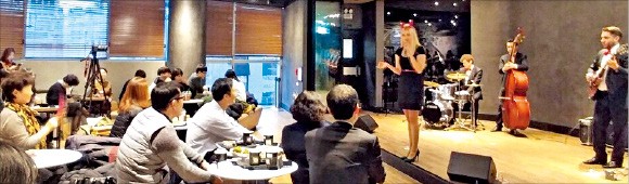 차향에 젖어 있는데 “같이 불러요”란 어눌한 한국말과 함께 재즈 선율이 퍼졌습니다. 스타벅스가 그렇게 자랑하던 커피스테이지(사진). 러시아 재즈밴드가 라이브로 들려주는 캐롤을 들으며 차를 마시는데 “아 진짜 너무 좋아”란 생각이 입 밖으로 나와버렸습니다. 공연이 없을 땐 커피스테이지를 스터디공간으로 빌려줍니다. 3만원(4~12명)만 내면 인원수에 상관없이 3시간 동안 쓸 수 있습니다. 이용객은 커피나 티 비교 시음을 해볼 수 있고, 세 가지 친환경 푸드도 줍니다.