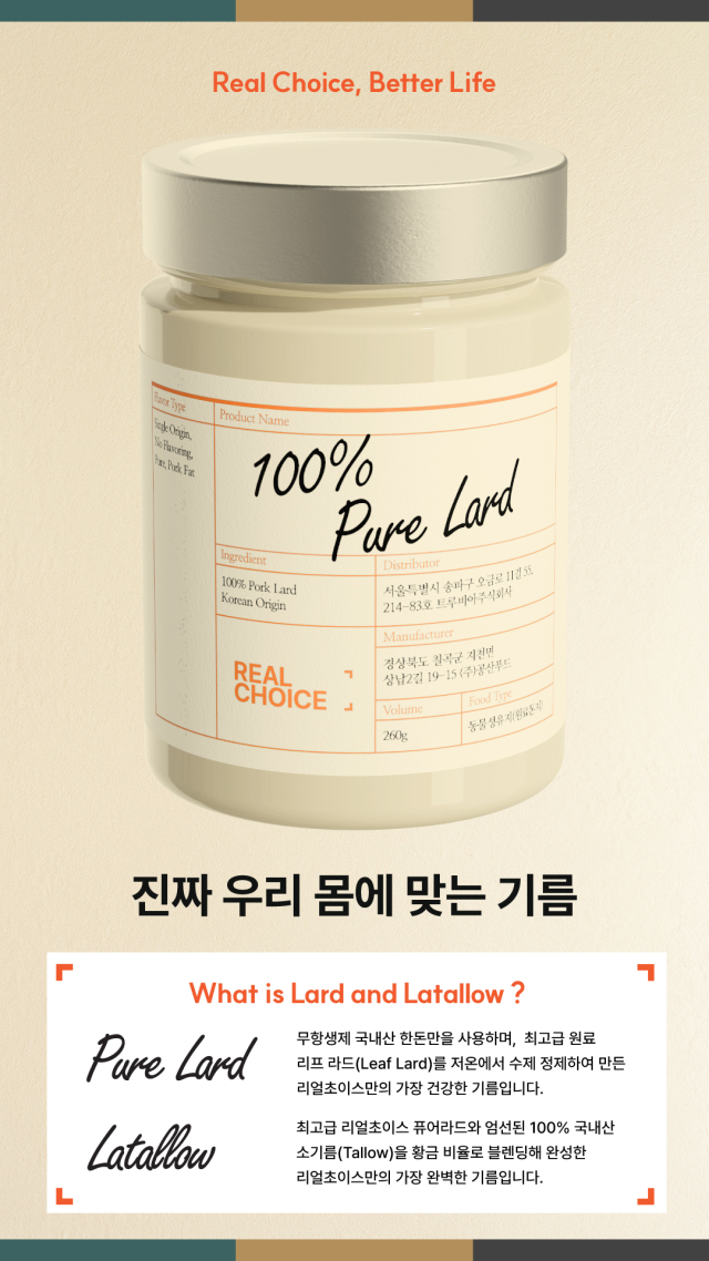 이번에 출시된 라드와 라텔로는 '리얼초이스'란 브랜드로 판매될 예정이다. "씨앗기름 중심의 현대 식단이 남긴 문제를 넘어 우리 몸에 맞는 진짜 기름을 되찾는다"는 브랜드 철학을 전달하겠다는 게 트루비아의 목표다.