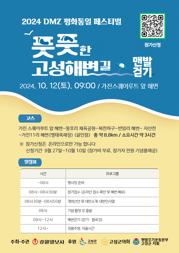 【고성】창간 79주년을 맞이한 강원일보사는 12일 동해안 최북단 고성에서 2024 DMZ 평화통일 페스티벌 ‘풋풋한 고성해변길 맨발 걷기’ 행사를 개최한다.