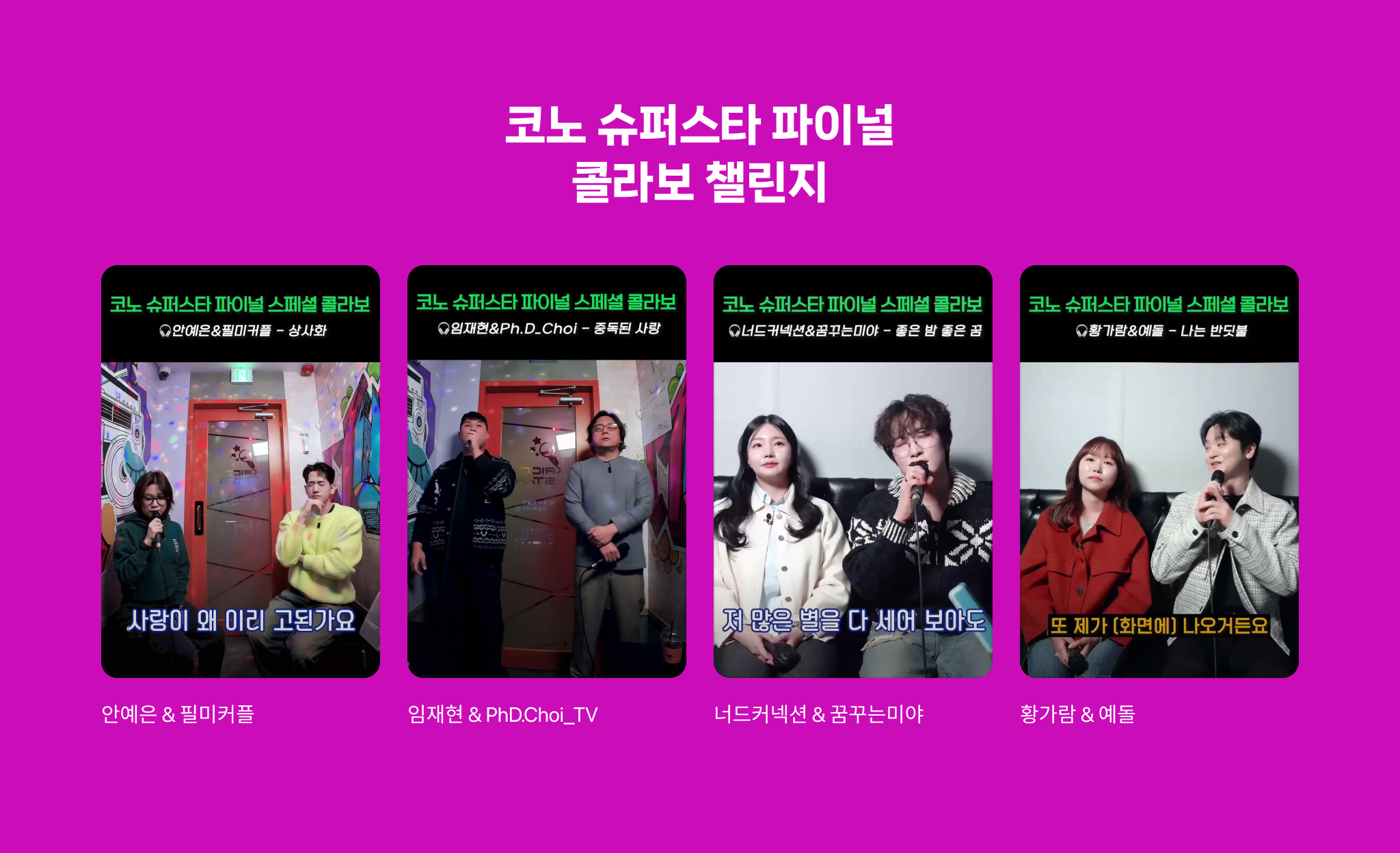 -코노챌린지 참여로 업로드한 콘텐츠는 네이버의 마케팅 (서비스 내 프로모션, SNS, 외부 광고 등)에 2차 가공되어 사용될 수 있습니다.