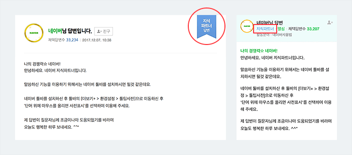 2. 지식iN 답변페이지에서 일반답변과 구별되도록 지식파트너 표식이 적용됩니다.